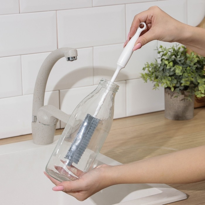 - Кухонный ёрш подходит для мытья посуды, детских бутылочек, сосок, банок, колб кальянов, ваз, кувшинов, чайников, бутылок, термосов, стаканов, графинов и прочей глубокой посуды с узким горлышком.