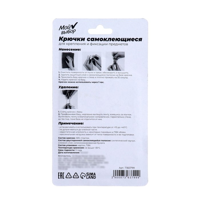 Крючки самоклеящиеся Доляна «Классика», 6 шт, цвет белый