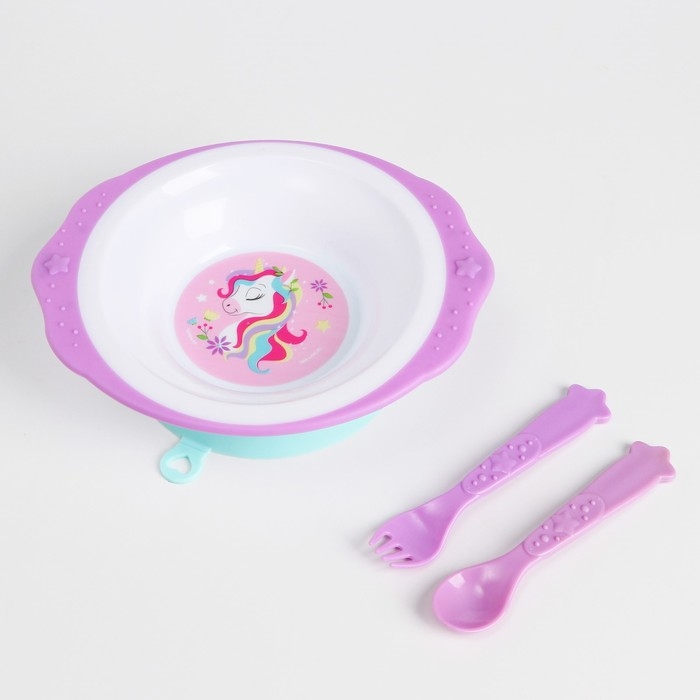 Набор детской посуды «Единорожек», тарелка на присоске 250мл, вилка, ложка