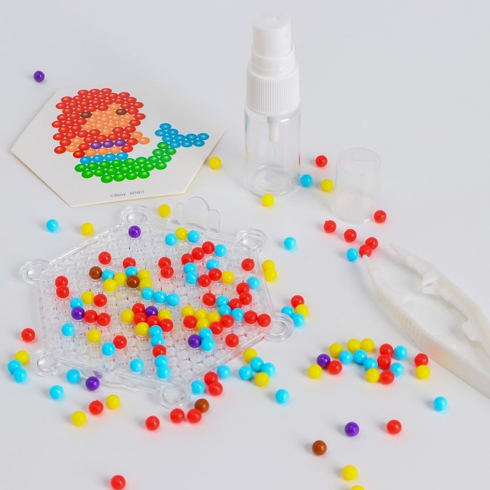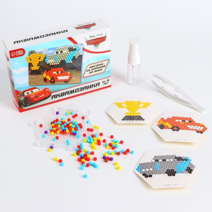 С аквамозаикой с декорациями «Тачки» ребёнок соберёт из шариков-пикселей 3 объёмных фигурки, потренирует мелкую моторику и внимание. С поделками можно играть или украсить интерьер.