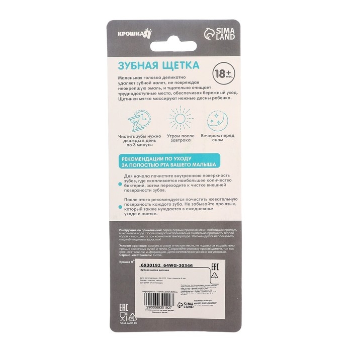Зубная щётка предназначена для ежедневного ухода за детскими зубами и полостью рта. Мягкие щетинки позволяют бережно и эффективно удалять зубной налёт, мягко массируя нежные дёсны ребёнка. Специально разработанная головка щетки позволяет тщательно очистить труднодоступные места.Ручка имеет удобную форму, комфортно ложится в детскую ладошку. Не выскальзывает из рук. Изготовлено из безопасных материалов.