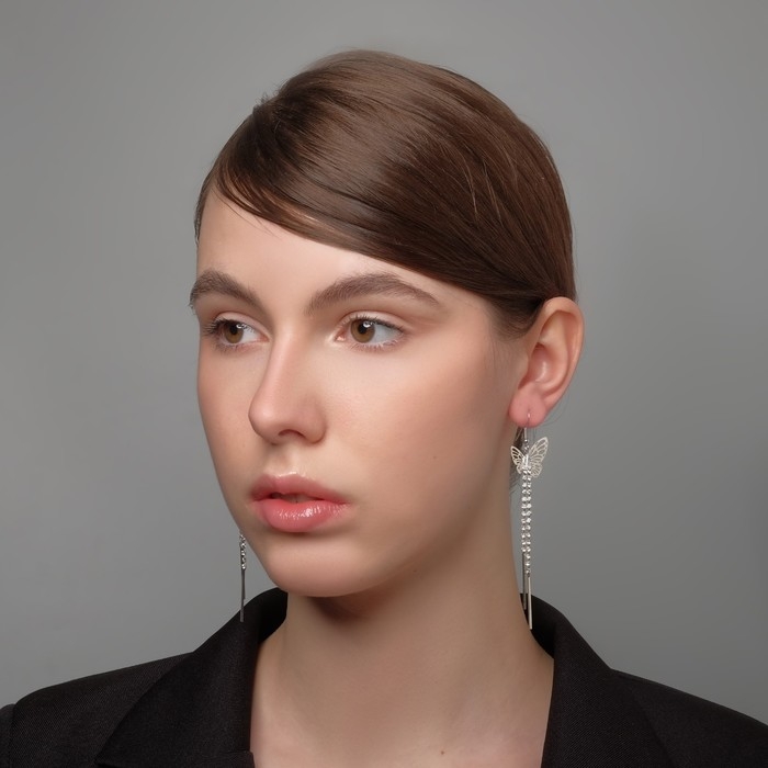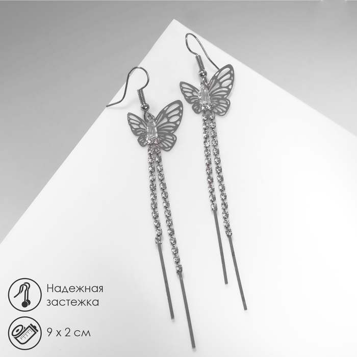 Серьги висячие со стразами «Бабочки» нити, цвет белый в серебре, 9 см