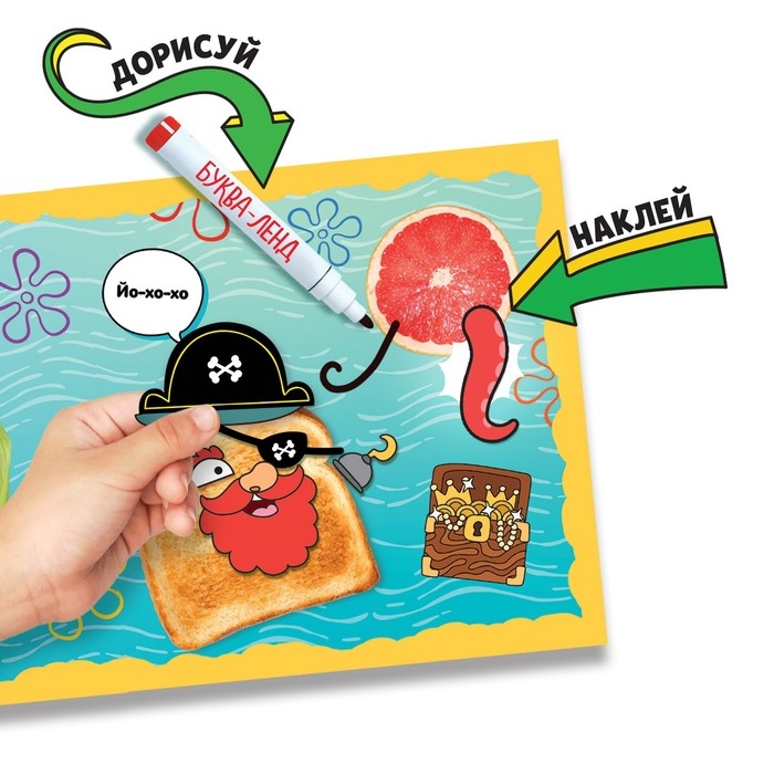 В комплекте: 20 глазок на клейкой основе, маркер на водной основе со стирателем, 140 многоразовых наклеек (можно клеить по 3−4 раза).