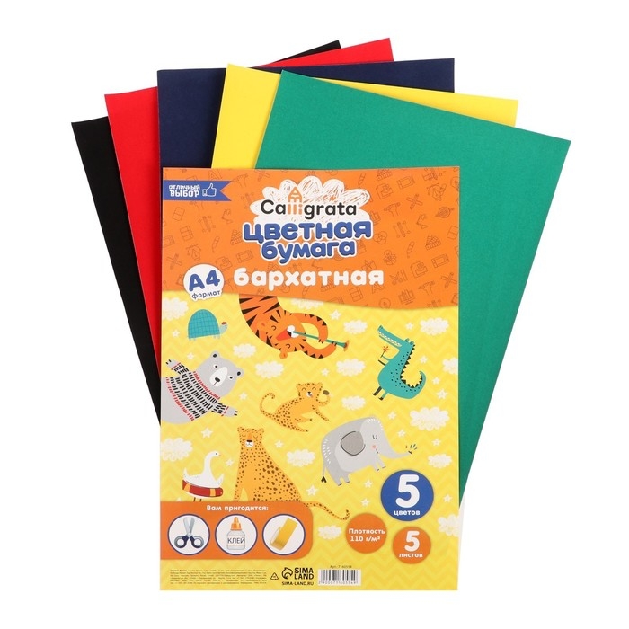 Набор бумаги бархатной А4, 5 листов, 5 цветов, плотность 110г/м2