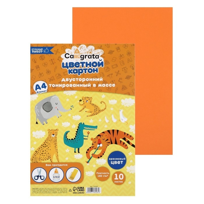 Картон цветной двусторонний А4, тонированный в массе, 10 листов, 180 г/м2, оранжевый