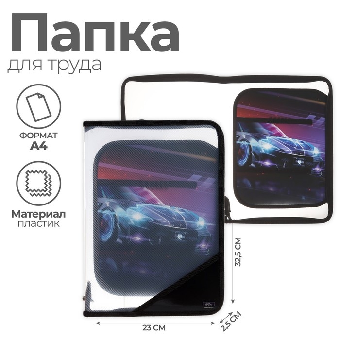 Папка для труда А4, 325 х 230 х 25 мм, молния вокруг, откидная планка, пластиковая, ПТР-1, Calligrata "Тачка"
