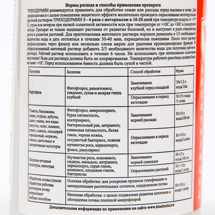 Высокоэффективный биологический препарат для борьбы с широким спектром возбудителей грибных и бактериальных заболеваний растений на основе спор и мицелия грибов Trichoderma harzianum subsp. trigo. Подавляет развитие фитопатогенов прямым паразитированием, конкуренцией за субстрат, выделением ферментов, антибиотиков (глиотоксин, виридин, триходермин) и других биологически активных веществ. Подавляет патогенных возбудителей, распространяющихся через почву и растительные остатки.