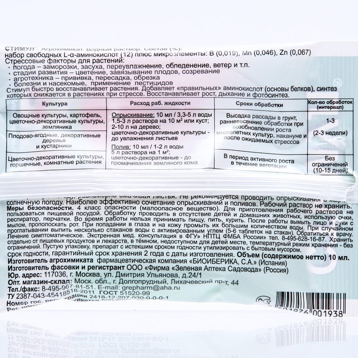 Стимул быстро восстанавливает растения. Добавляет «правильных» аминокислот (основы белков), синтез которых снижается в растениях при стрессе. Восстанавливает рост, дыхание и фотосинтез.