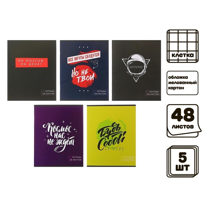 Комплект тетрадей из 5 штук, 48 листов в клетку, все тетради в комплекте пяти разных видов.