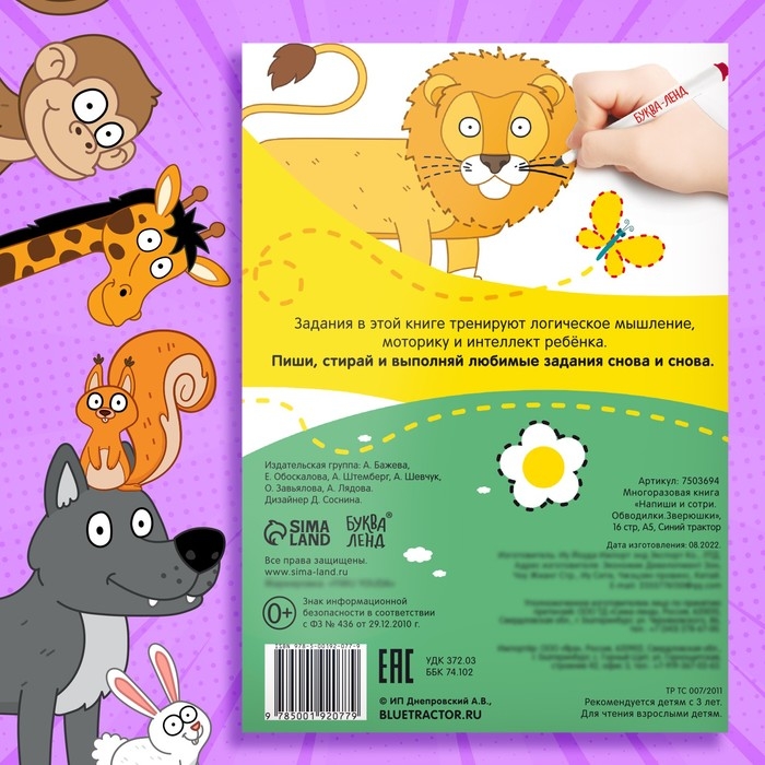 Многоразовая книга «Напиши и сотри. Обводилки.Зверюшки», 16 стр., А5, + маркер, Синий трактор