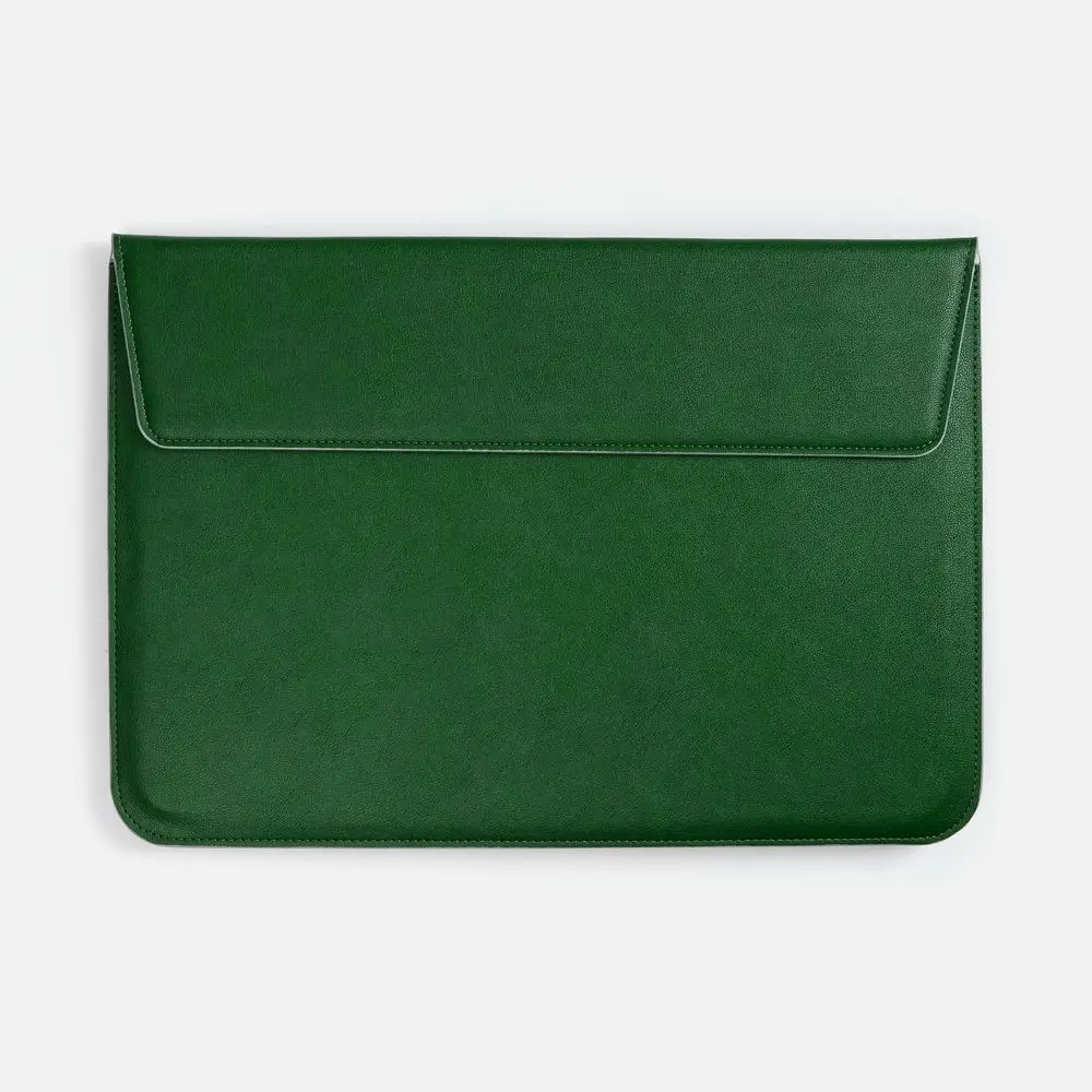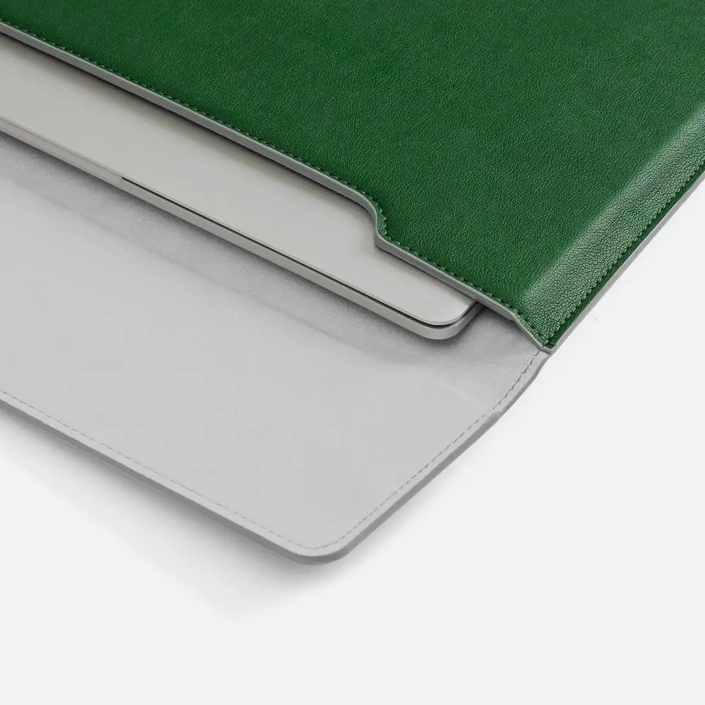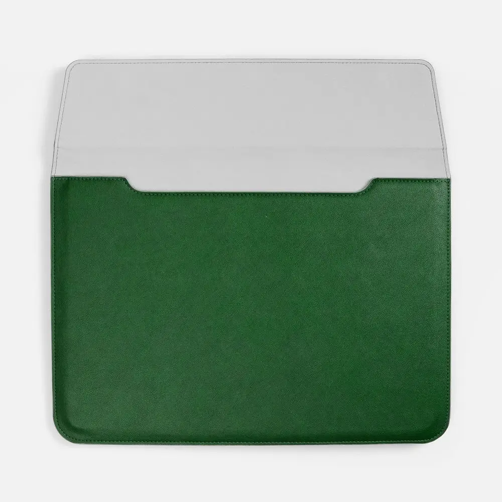 Чехол для ноутбука с диагональю до 15,6 выполнен из материала Petrus, зеленого цвета, дополнен окрашенным срезом края серого цвета.