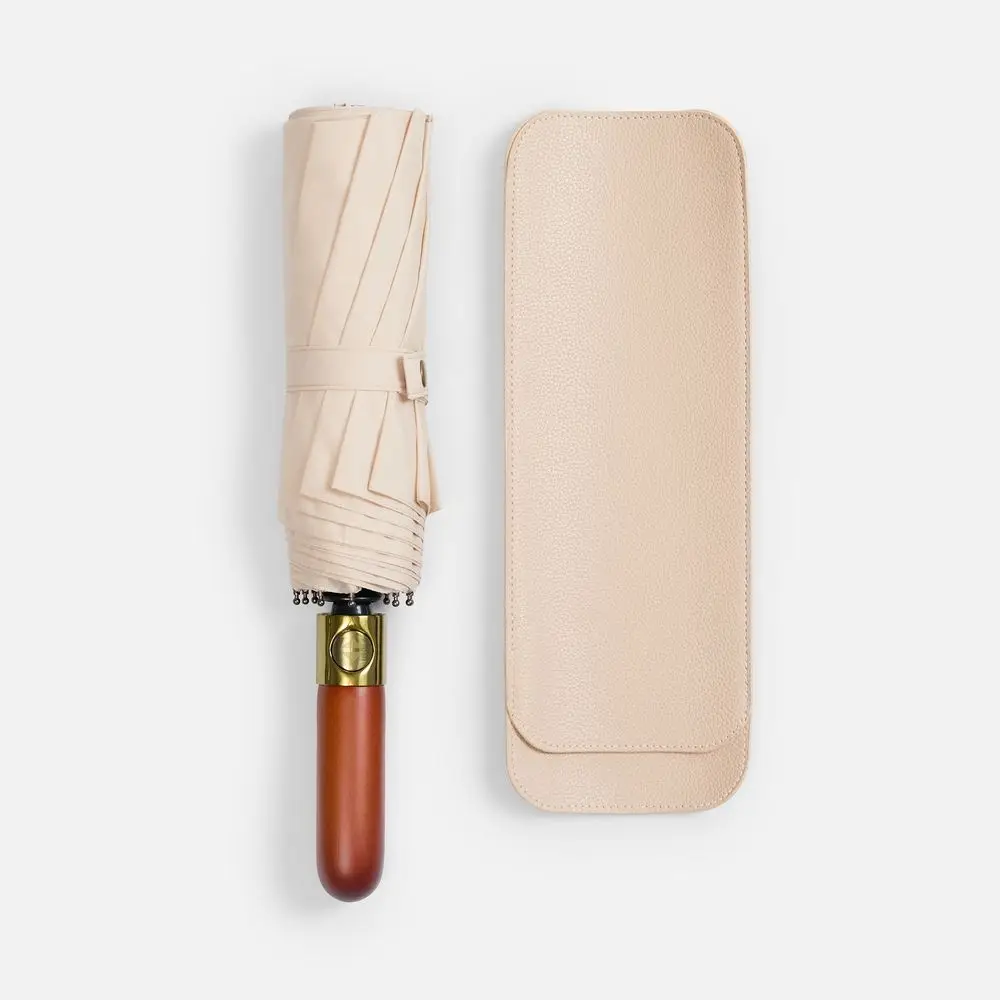 Складной зонт с большим куполом, системой антишторм и эргономичной ручкой из дерева.