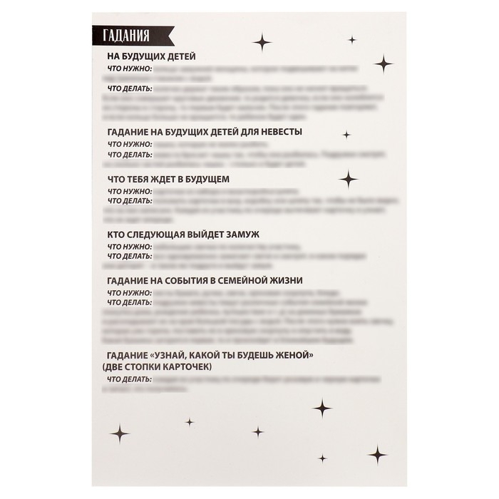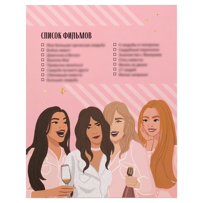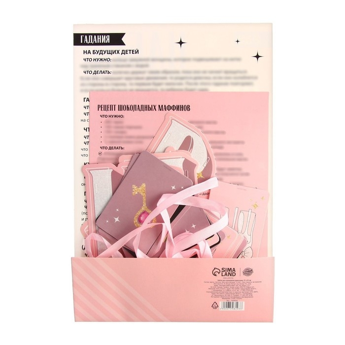 Устройте самый веселый, яркий и неповторимый праздник для невесты, который останется в памяти надолго. Набор для проведения девичника идеален для домашней вечеринки. Эта игра поможет отметить его весело, душевно и незабываемо. Подготовьте для каждой участницы любимые напитки и прекрасное настроение! Игра предусмотрена на любое количество участниц. Сценарий включает в себя 6 разнообразных гаданий с атрибутами для их проведения, также в наборе вы найдёте праздничную гирлянду на ленте "Девичник", список фильмов на вечер, рецепт маффинов, который в дальнейшем вы занесёте в свою кулинарную книгу.