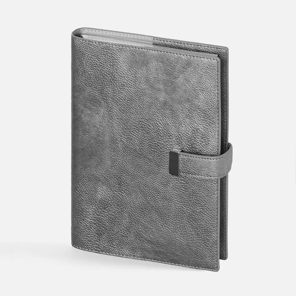 Ежедневник в мягком переплете со съёмная обложкой, дополнен застёжкой-хлястиком с металлическим шильдом на кнопке, двойным ляссе и капталом.