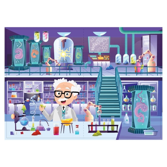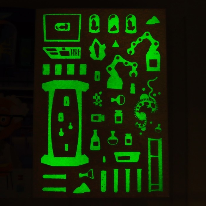 Профессор Чудачкин обожает работать в лаборатории ночью. Приклейте наклейки, выключите свет и посмотрите, какие эксперименты он проводит!