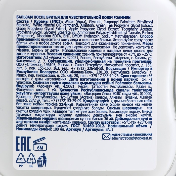 Бальзам после бритья Foammen для чувствительной кожи, 100 мл