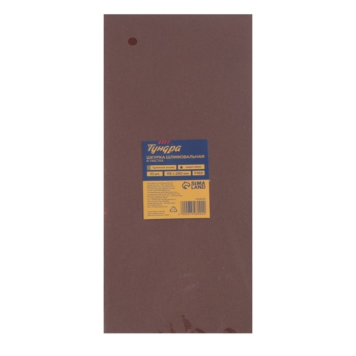 Шкурка шлифовальная в листах ТУНДРА, на бумажной основе водост., 115 х 280, Р180, 10 шт.