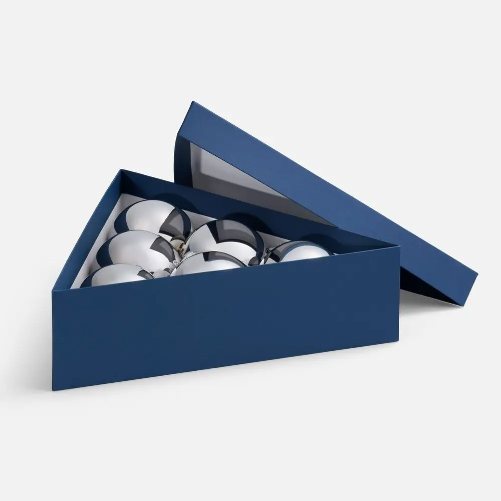 Трехгранная коробка Trigon прекрасно подходит для упаковки набора из шести елочных шаров диаметром 10 см, а также других подарков нестандартной формы.