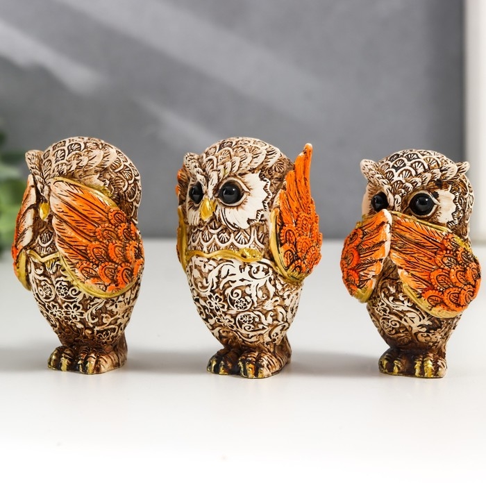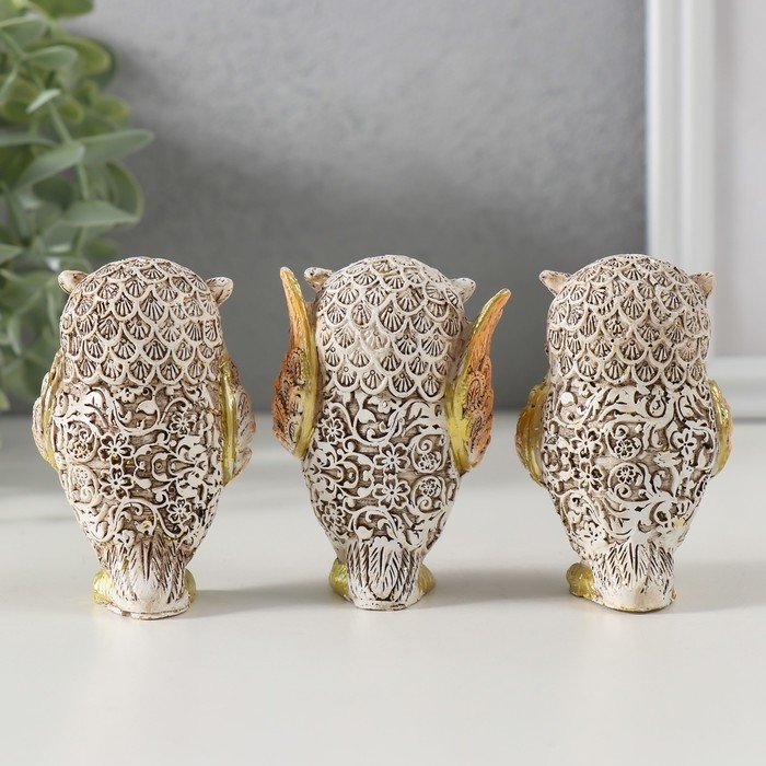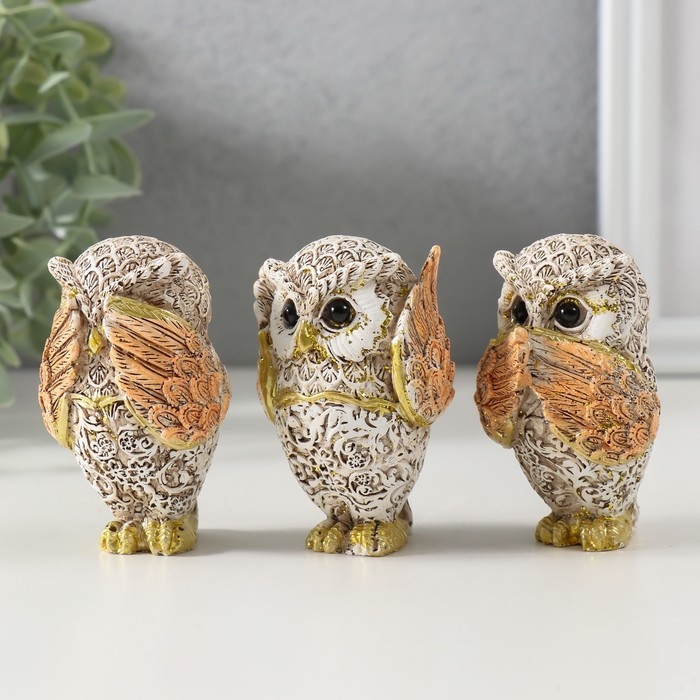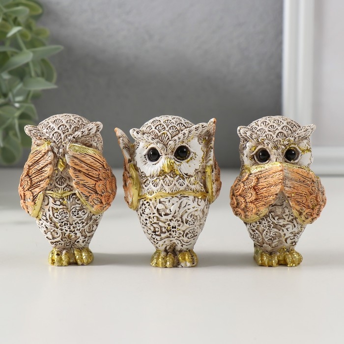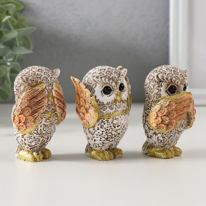 Сувенир полистоун "Филин - не вижу, не слышу, не скажу" беж с золотом МИКС 7х4,5х3,5 см