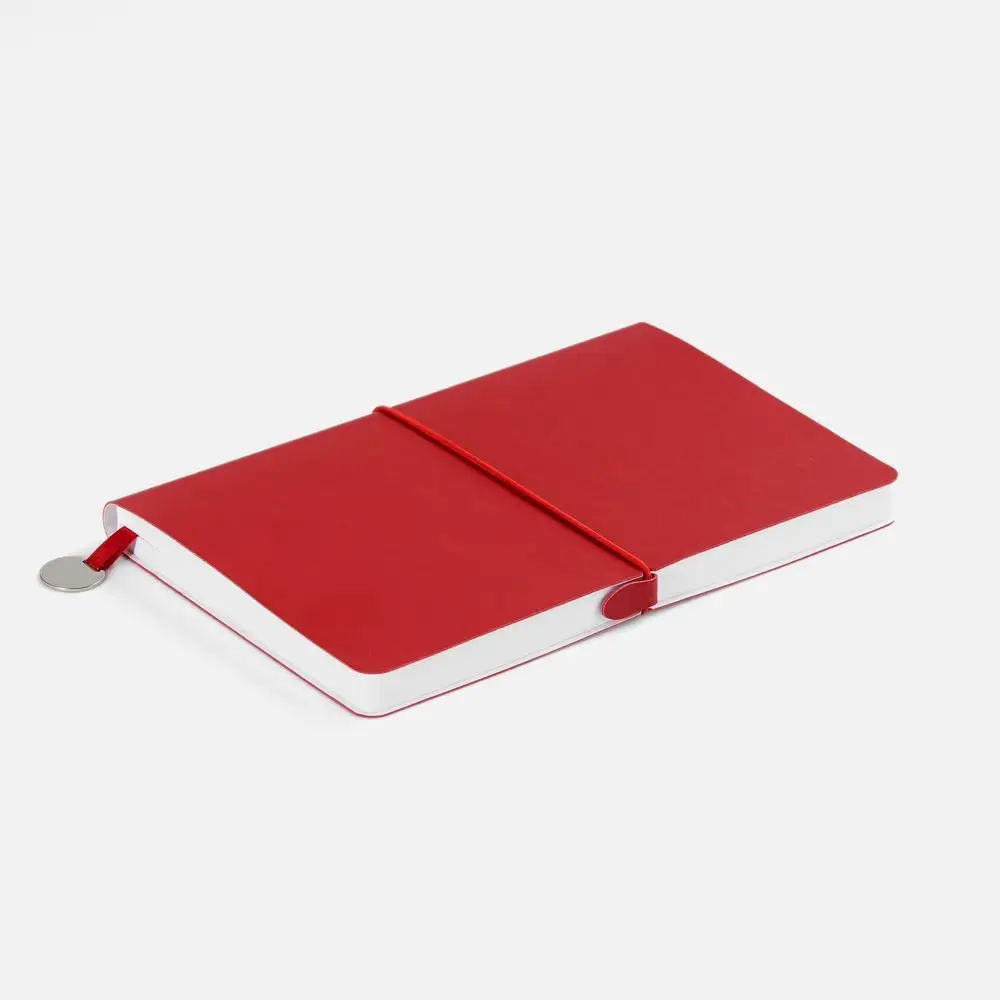 Ежедневник с гибкой обложкой, выполнен из материала Waltz, красный РР, дополнен ляссе в цвет обложки с металлическим шильдом.