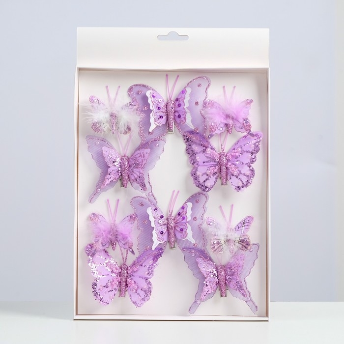Бабочки для декора и флористики, на прищепке, пластиковые, фиолетовые, микс, 5 см и 8 см