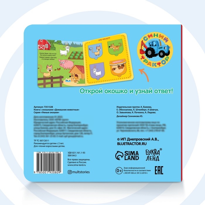 Картонная книга с окошками «Домашние животные», 10 стр., 16 окошек, Синий трактор