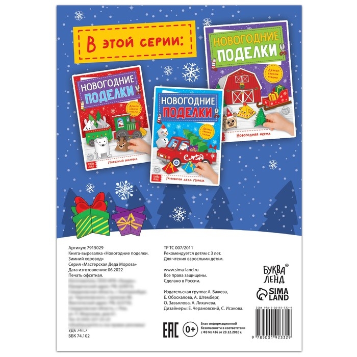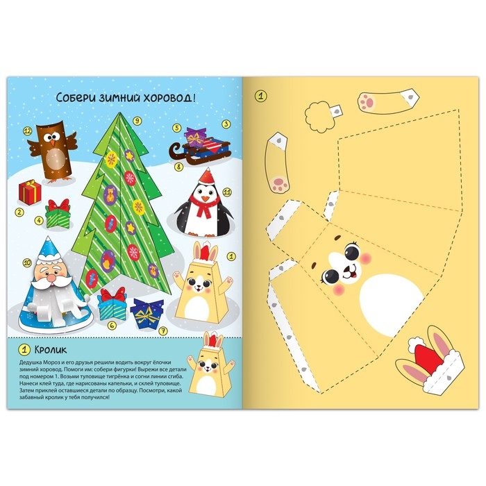 С книгой вы сможете вместе с ребёнком смастерить целый хоровод новогодних персонажей. Внутри вы найдёте заготовки для 12 праздничных поделок.