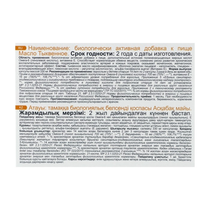 Биологически активная добавка к пище, дополнительный источник полиненасыщенных жирных кислот Омега-6 (линолевой кислоты), витамина Е. Способствует нормализации обмена веществ, снижению риска развития хронических воспалительных заболеваний, поддержанию эластичности артерий и кожных покровов, оказывает мочегонное, желчегонное, антипаразитарный эффект. Форма выпуска: капсулы массой 330 мг.