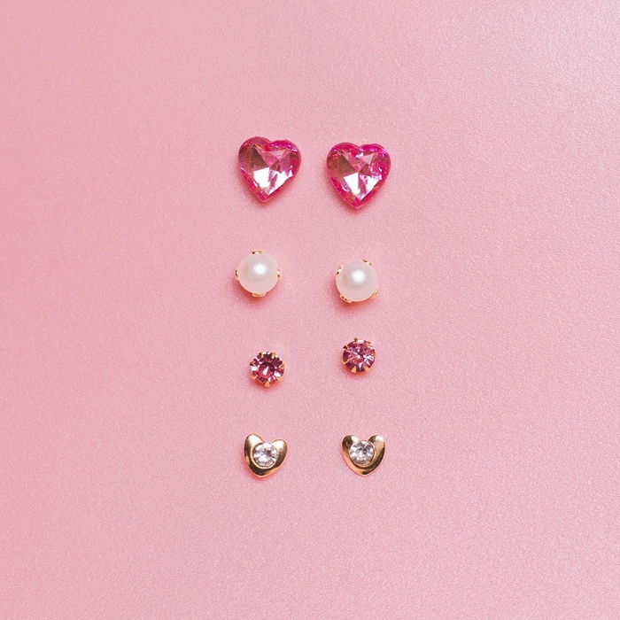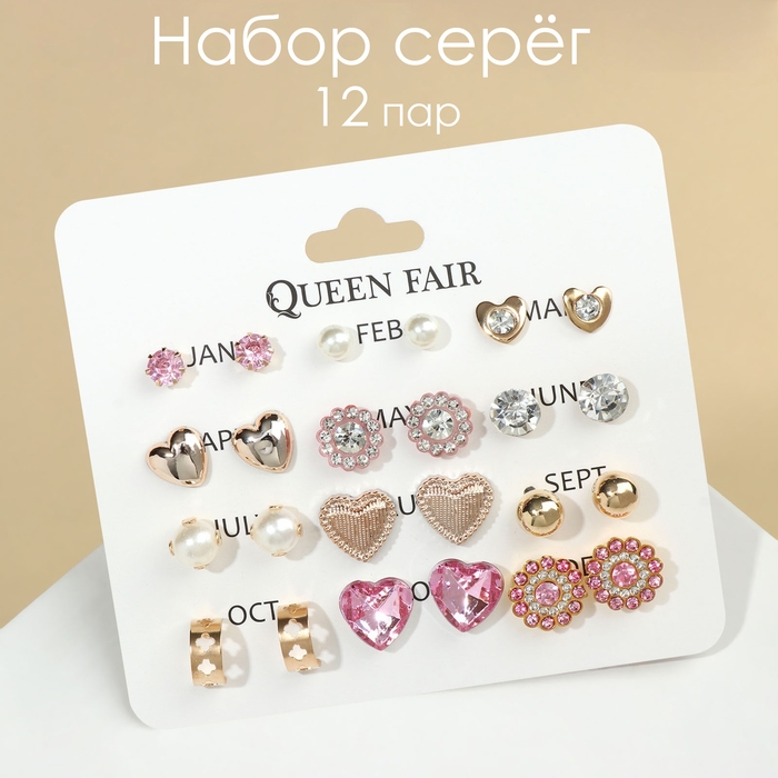 Пусеты 12 пар «Фантазия» сердца, бело-розовый в золоте