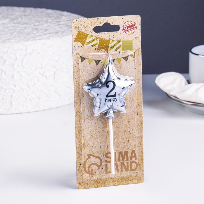 Свеча в торт на шпажке "Воздушный шарик.Звезда", цифра 2, 5,5 см, серебряная