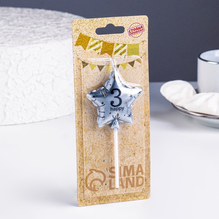 Свеча в торт на шпажке "Воздушный шарик.Звезда", цифра 3, 5,5 см, серебряная