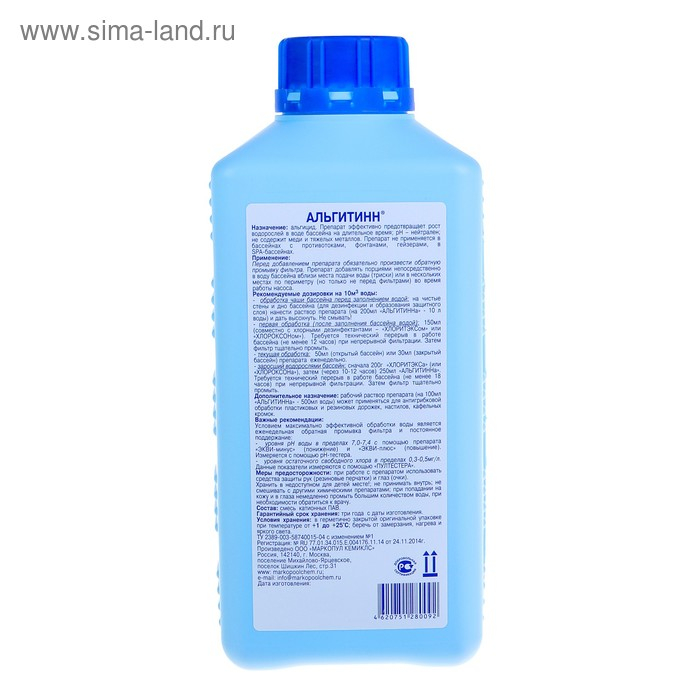 Препарат рН - нейтрален; не содержит хлора и тяжелых металлов; с пониженным пенообразованием, добавляют с помощью мерника или автоматического дозирующего устройства непосредственно в плавательный бассейн около места подачи воды при работающем циркуляционном насосе. Дополнительное назначение: рабочий раствор препарата (на 100мл Альгитинна - 600мл воды) может применяться для антигрибковой обработки пластиковых и резиновых дорожек, настилов, кафельных кромок.
