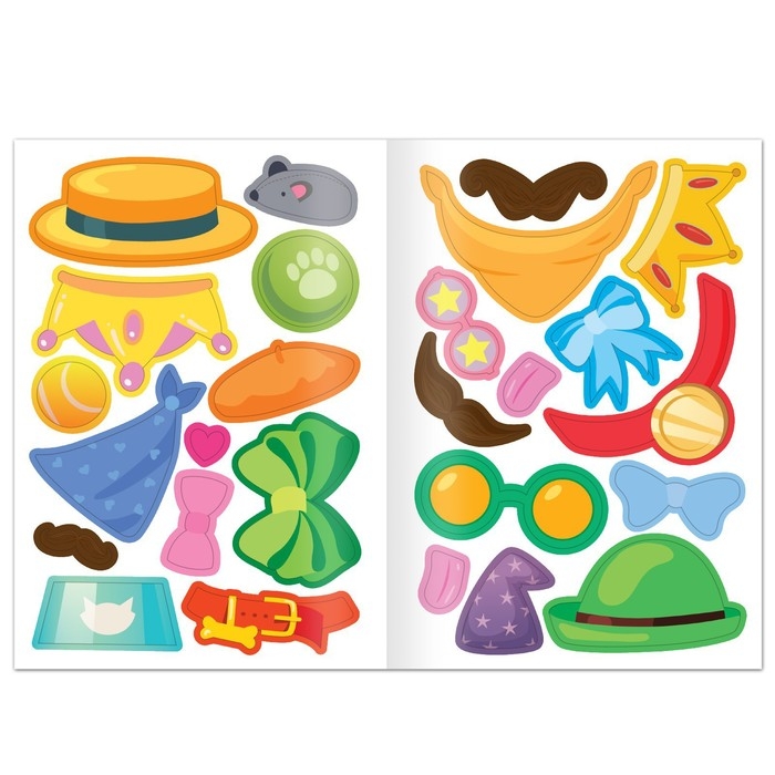 - На каждой страничке малыша ждёт основа — фотография животного. Задача ребёнка — приклеить стикеры с разными аксессуарами.