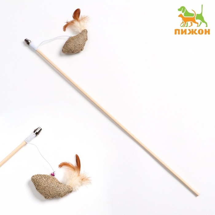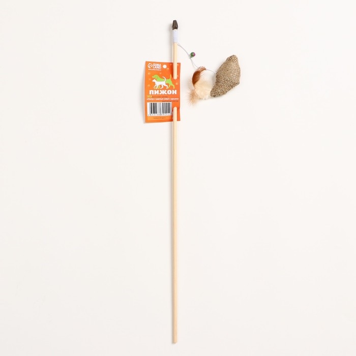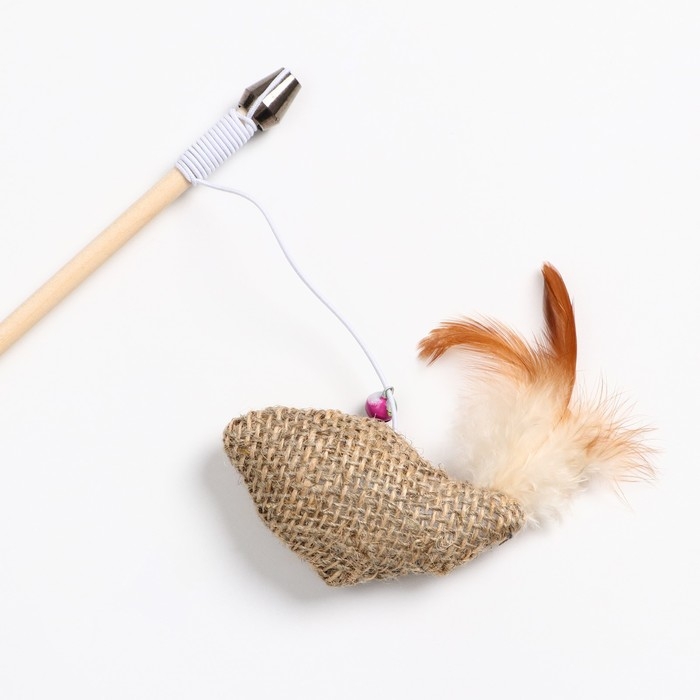 Дразнилка-удочка из эко-материалов "Птичка с кошачьей мятой и перьями", деревянная палочка