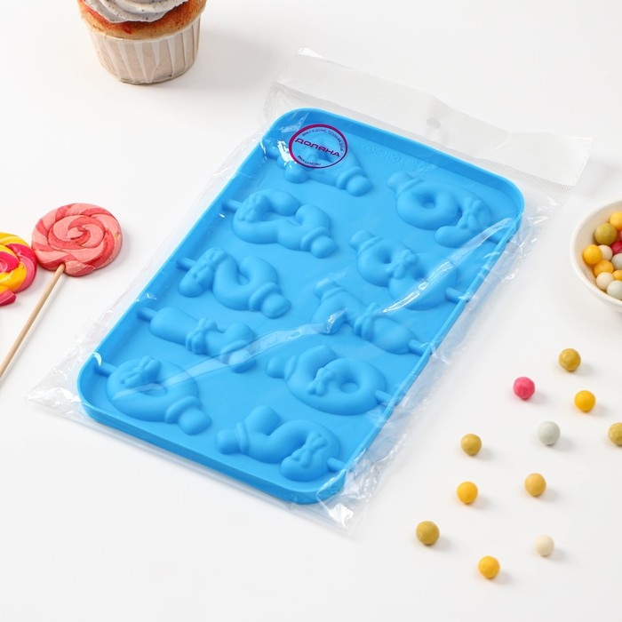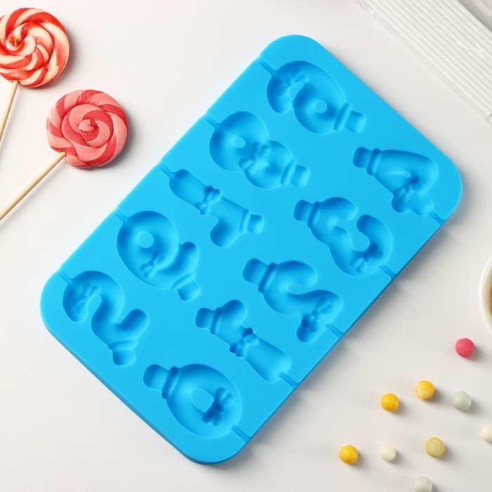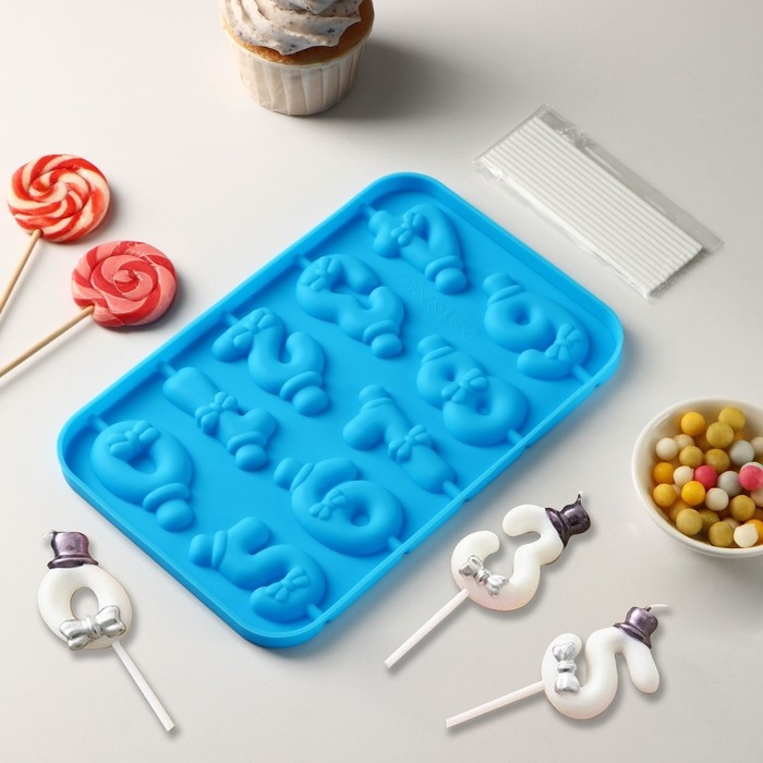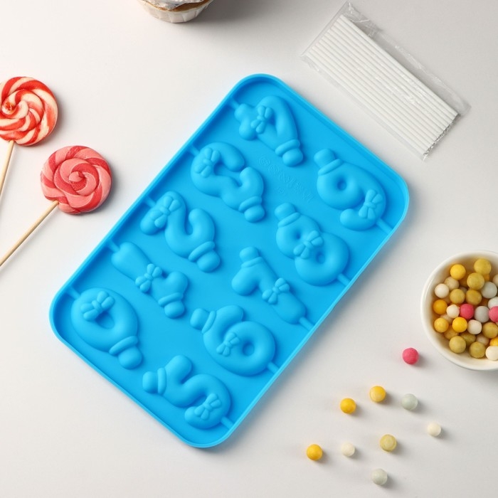 Форма для леденцов Доляна «Цифры-мальчики», силикон, 22×14×1 см, 10 ячеек (5,5×3,5 см), с палочками, цвет синий