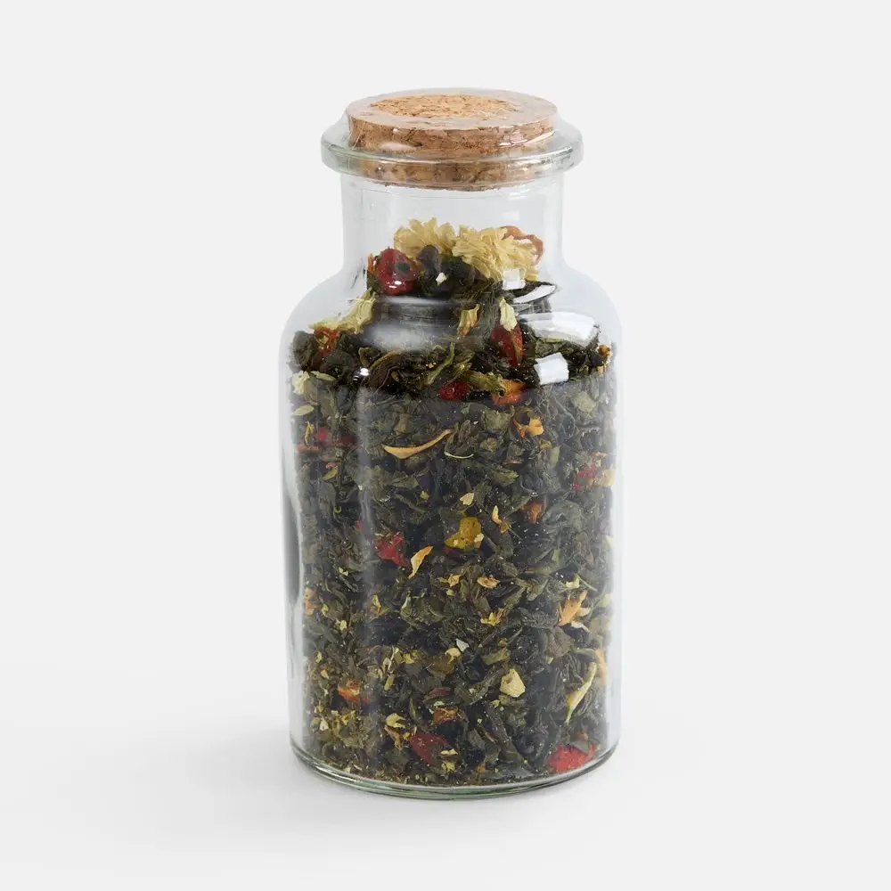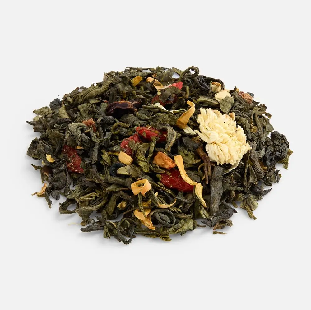Насыщенный медовый десерт с хрустящими орехами, яркими цукатами и полезными семенами составляет идеальную партию зеленому чаю особого купажа, в основе которого нежные листья зеленого чая в обрамлении сладковатых нот кэроба и сушеного яблока. Ягоды годжи и сублимированная клубника дарят витаминную свежесть, а цветки хризантемы и апельсинового дерева — тонкий цветочный аромат.