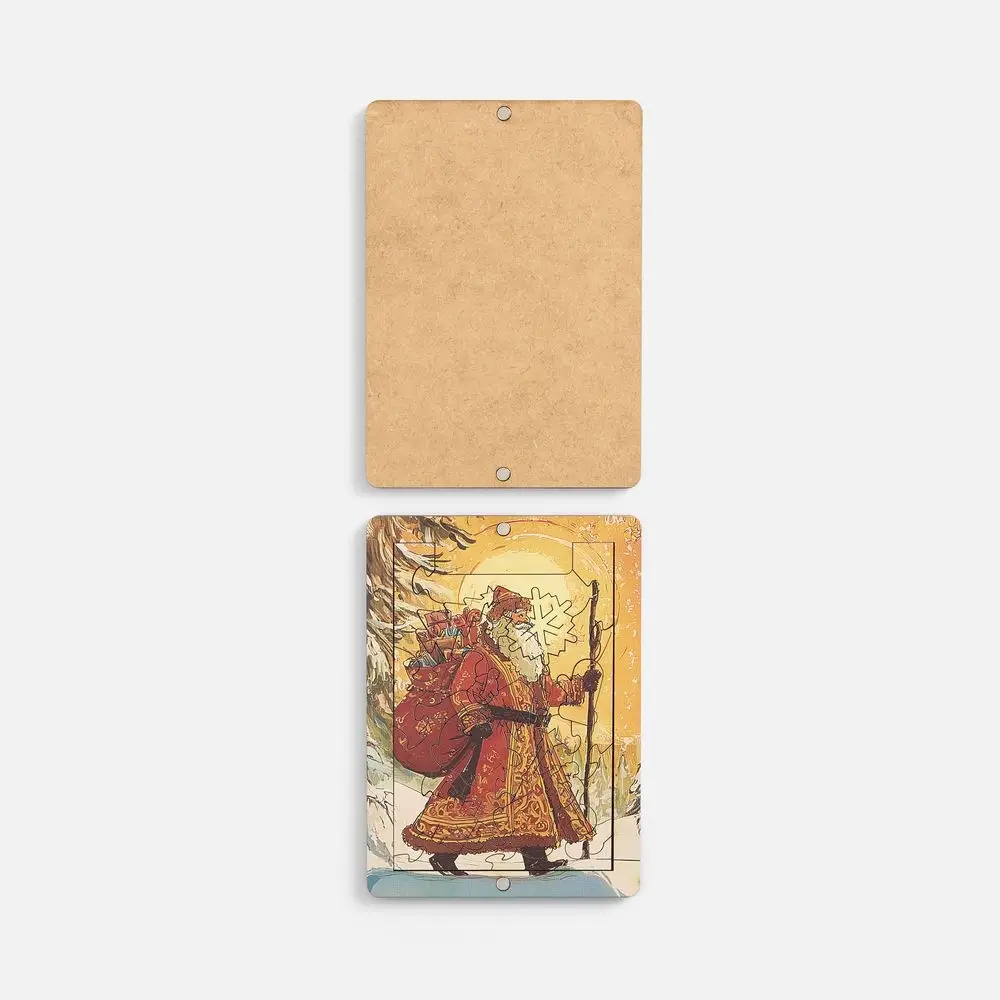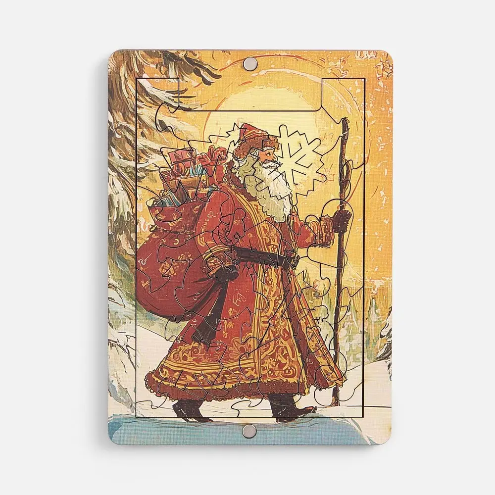 Пазлы изготовлены из дерева, а сама новогодняя картинка оформлена в открыточном ретростиле. В центре композиции — величественный Дед Мороз с богатым мешком подарков, символизирующий радость Нового года. Это не просто подарки, но и наступающий год, щедрый на все самое хорошее: радость, достаток и впечатления.