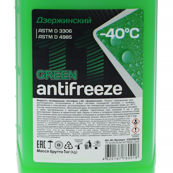 Антифриз «Дзержинский» Green предназначен для охлаждения любых типов двигателей внутреннего сгорания. Обеспечивает эффективную защиту системы охлаждения от замерзания, коррозии и перегрева. Произведен из высококачественного этиленгликоля с добавлением современного комбинированного пакета присадок. Предотвращает образование отложений в охлаждающих каналах двигателя и радиатора, продлевает срок службы водяного насоса. Антифриз «Дзержинский» GREEN рекомендован для современных отечественных и импортных автомобилей. Продукт готов к применению. Применять при температуре окружающей среды не ниже -40°С.