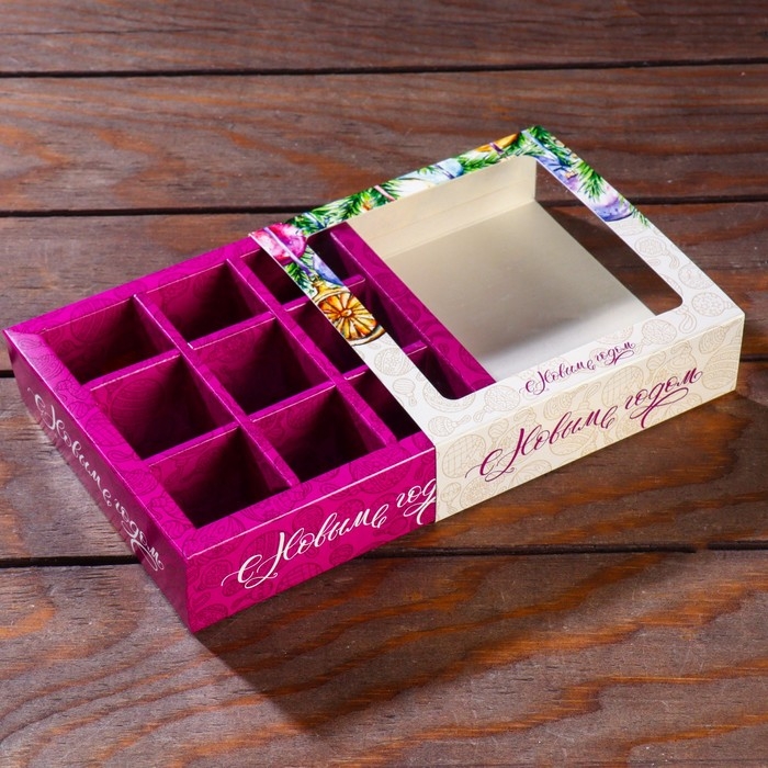 Новый год. Коробка под 9 конфет с обечайкой "Елочные игрушки", 13,7 х 13,7 х 3,5 см