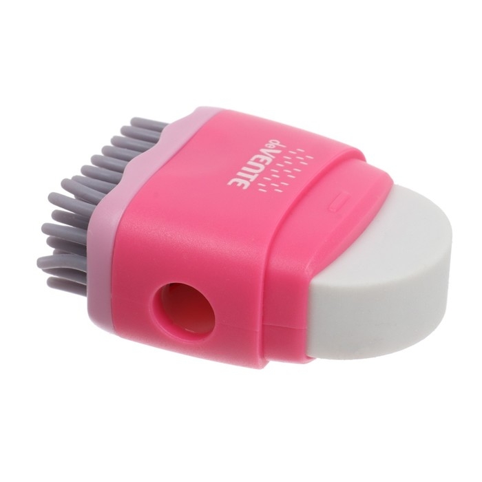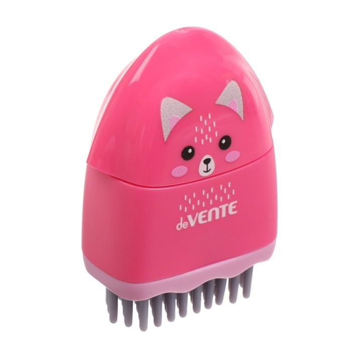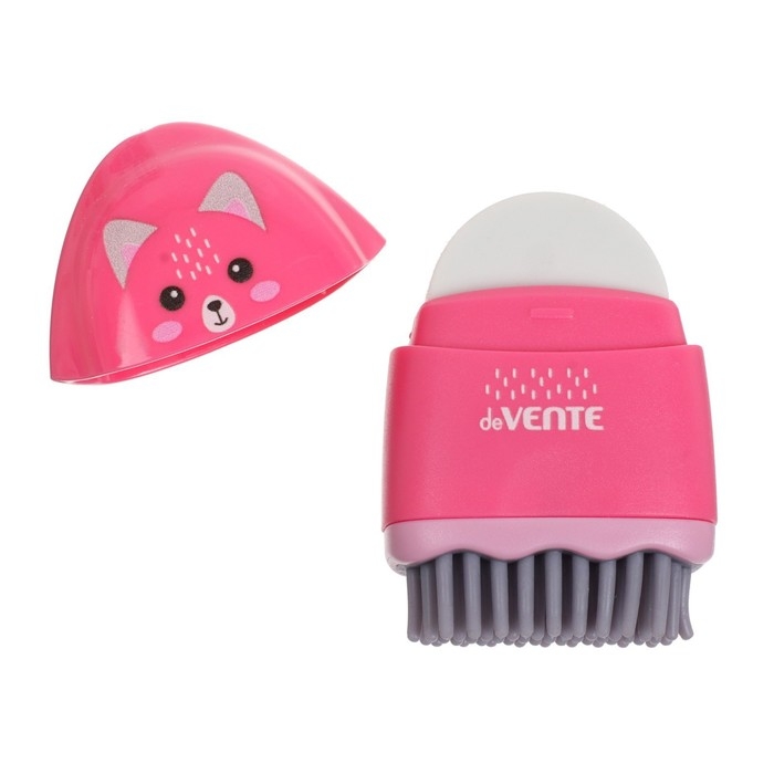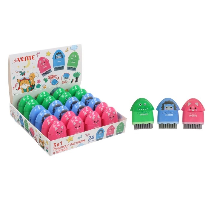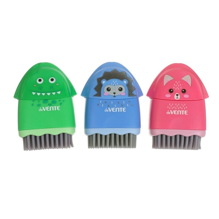 Точилка и ластик 3 в 1 "deVENTE. Animals" 1 отверстие, пластиковая цветная с контейнером, ластик белый из синтетического каучука, с кисточкой для удаления грязи и пыли, каждая с индивидуальной маркировкой, ассорти, в картонном дисплее.