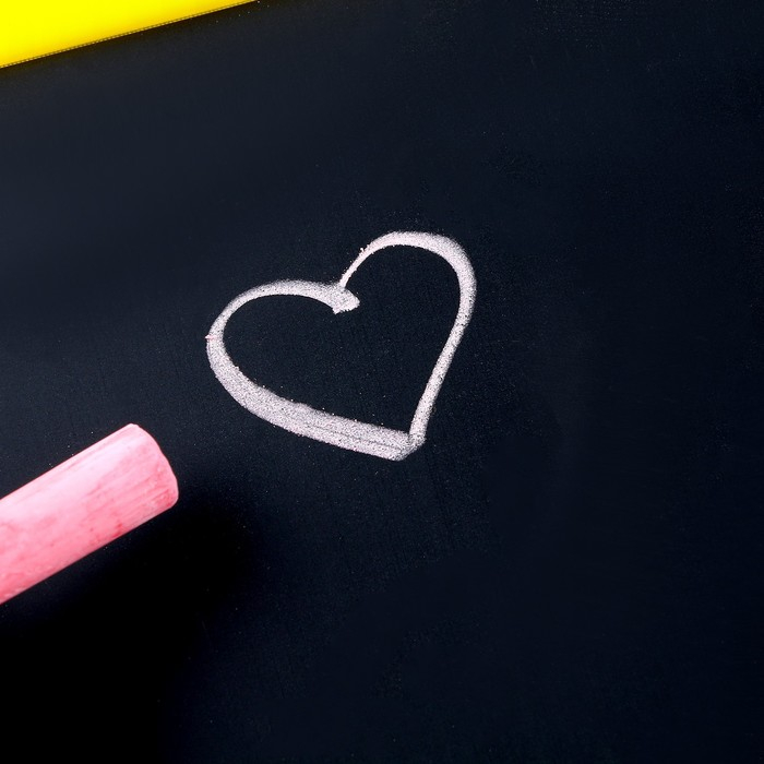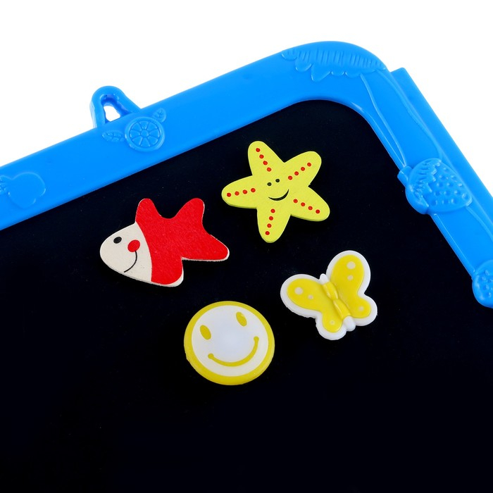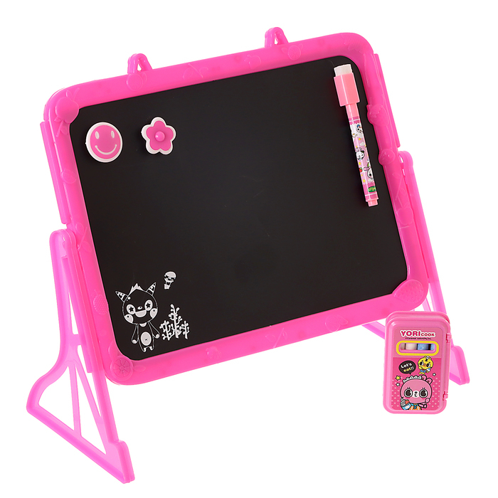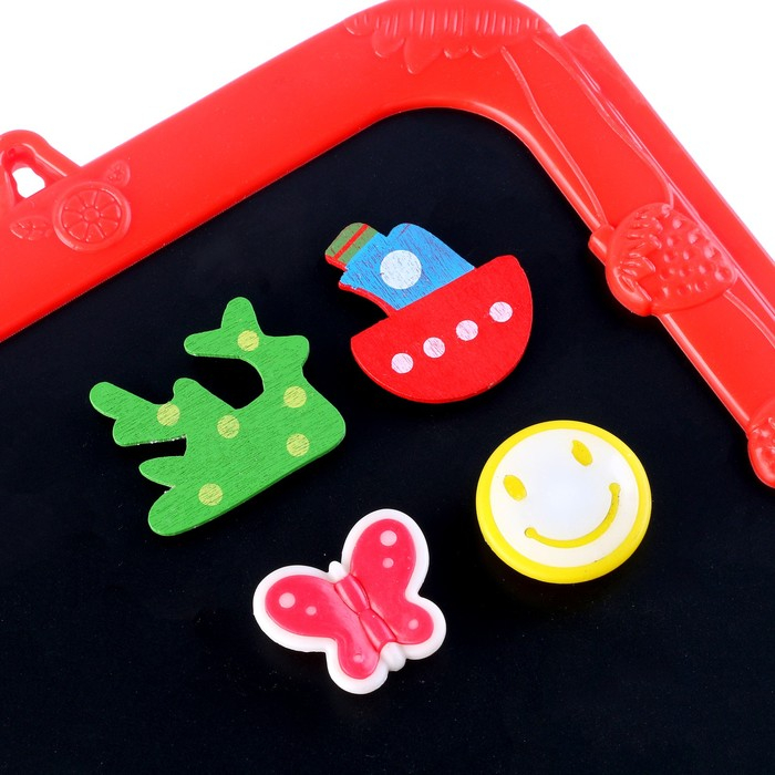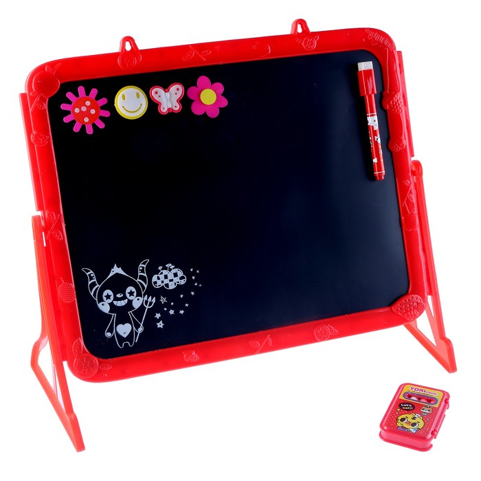 Доска выполнена из пластика. Одна сторона предназначена для рисования мелками, а магнитная поверхность — для рисования водными маркерами. В комплект входят яркие магниты, мел, губка для стирания, водный маркер.