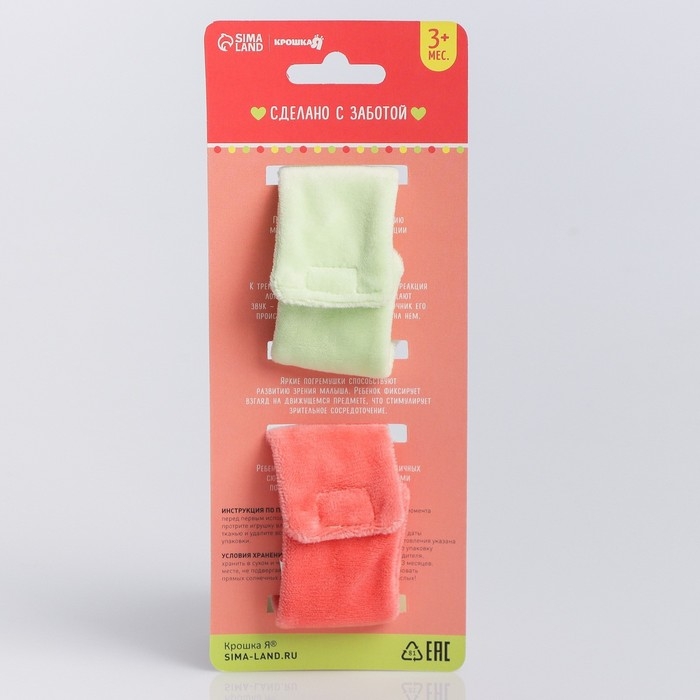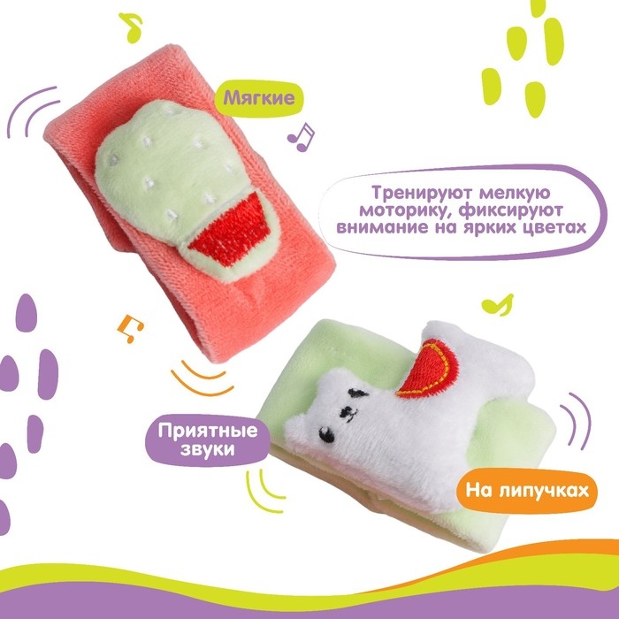 Развивающая игрушка выполнена в виде браслетика на липучке. В комплект входят две штуки. Их можно надеть малышу на ручки или ножки. Звуковые элементы будут греметь, когда непоседа сменит положение тела.