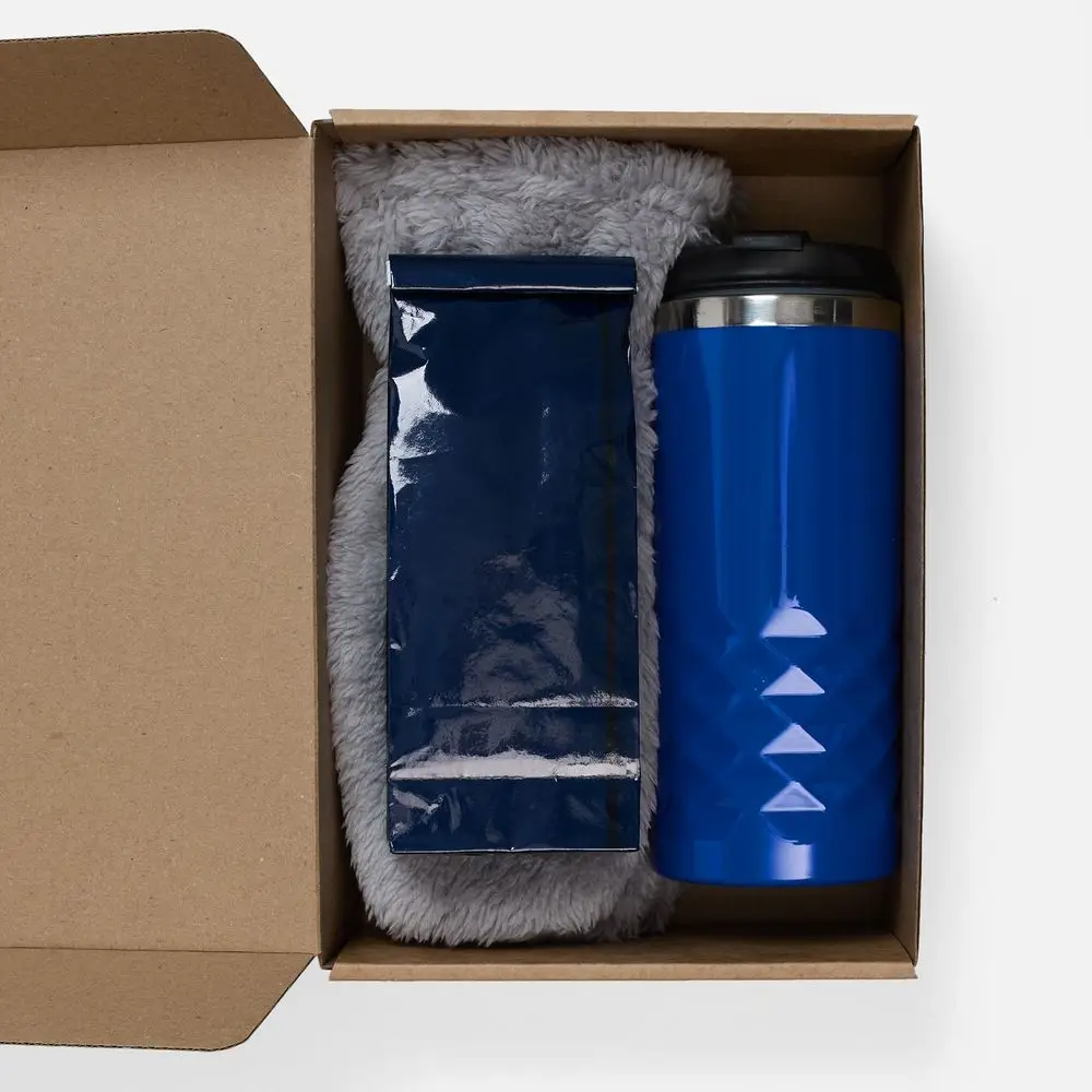 термостакан, крышка - пластик; внутренняя стенка - нержавеющая сталь; варежки - полиэстер 100%, плотность 280 г/м², длинноворсовый флис; коробка - микрогофрокартон