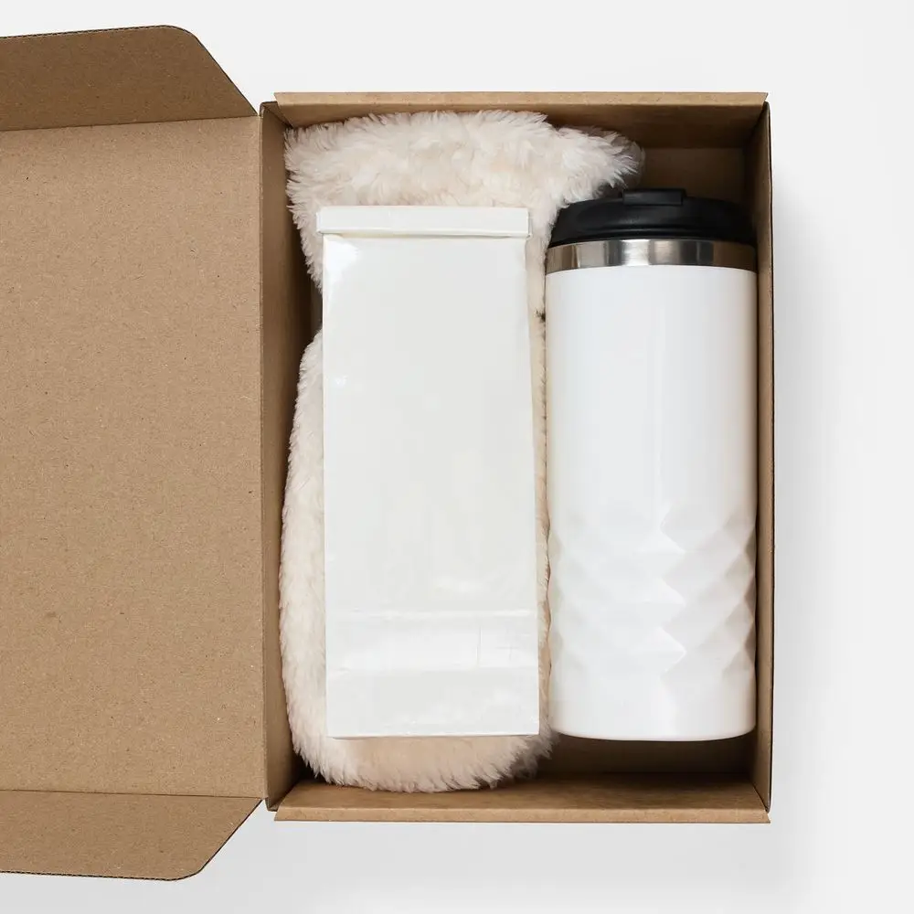 термостакан, крышка - пластик; внутренняя стенка - нержавеющая сталь; варежки - полиэстер 100%, плотность 280 г/м², длинноворсовый флис; коробка - микрогофрокартон