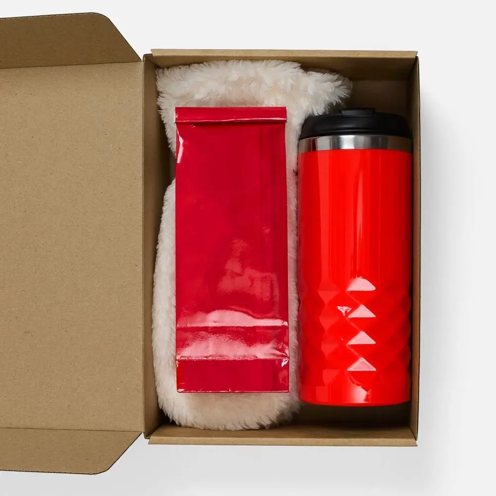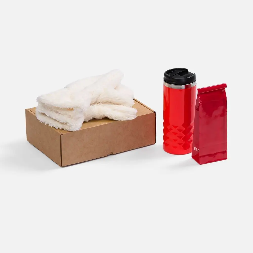 термостакан, крышка - пластик; внутренняя стенка - нержавеющая сталь; варежки - полиэстер 100%, плотность 280 г/м², длинноворсовый флис; коробка - микрогофрокартон