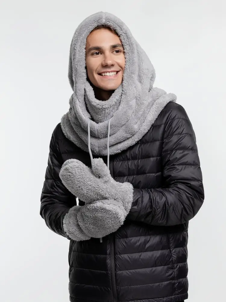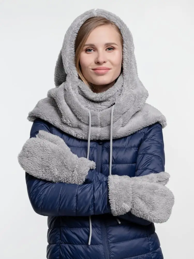 балаклава - полиэстер 100%, плотность 280 г/м², длинноворсовый флис; варежки - полиэстер 100%, плотность 280 г/м², длинноворсовый флис; коробка - микрогофрокартон, плотность 385 г/м²