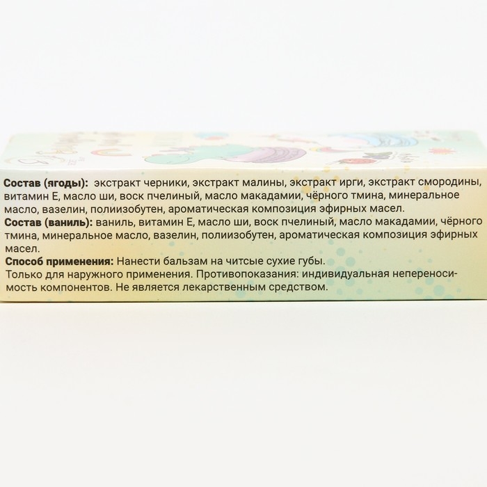 Состав: экстракты фруктов и ягод, витамин Е, масло ши, воск пчелиный, масло макадамии, масло черного тмина, минеральное масло, вазелин, полиизобутен, ароматическая композиция эфирных масел.