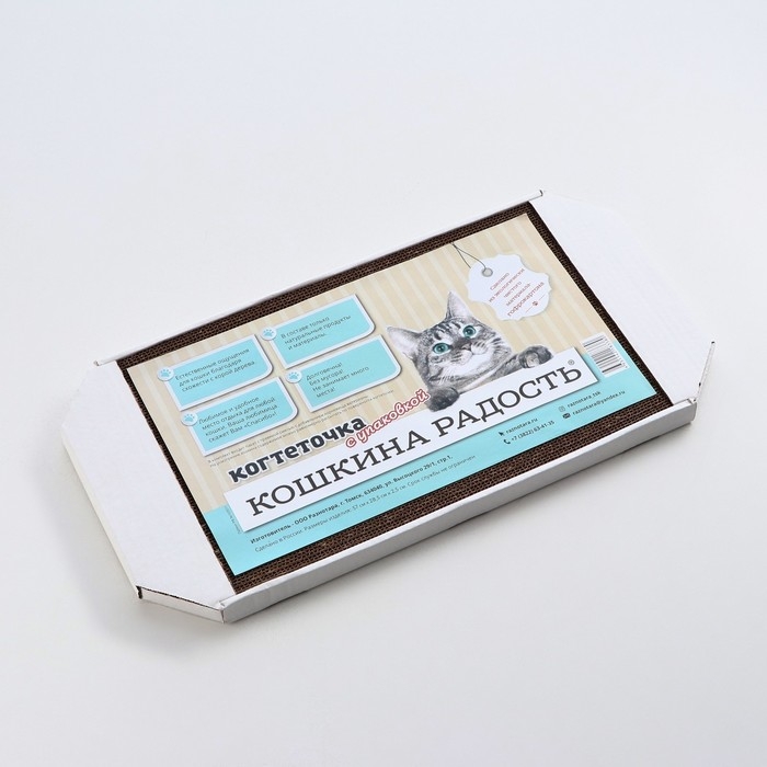 Он выполнен из гофрокартона, который изготовлен из природного материала - древесины и по своим свойствам очень на нее похож, чем и привлекают наших питомцев. Он достаточно плотен, чтобы выдержат острые коготки, и оптимально податлив, чтобы привлекать кошку.