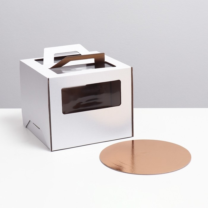 Коробка под торт 2 окна, с ручками, белая, + подложка 2,5 золото-белый , 28 х 28 х 20 см