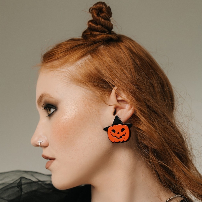 Серьги акрил «Тыковки» в шляпах ведьм, цвет оранжевый в чёрном металле